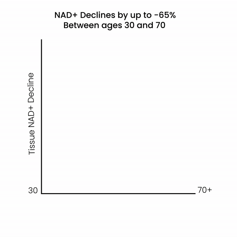 NAD+ naturally declines from birth, accelerating around age 30 and decreasing by up to 65% by age 70. Environmental stress, lifestyle factors, and health challenges can further deplete NAD+ by up to 80%, impacting your energy, resilience, and longevity.